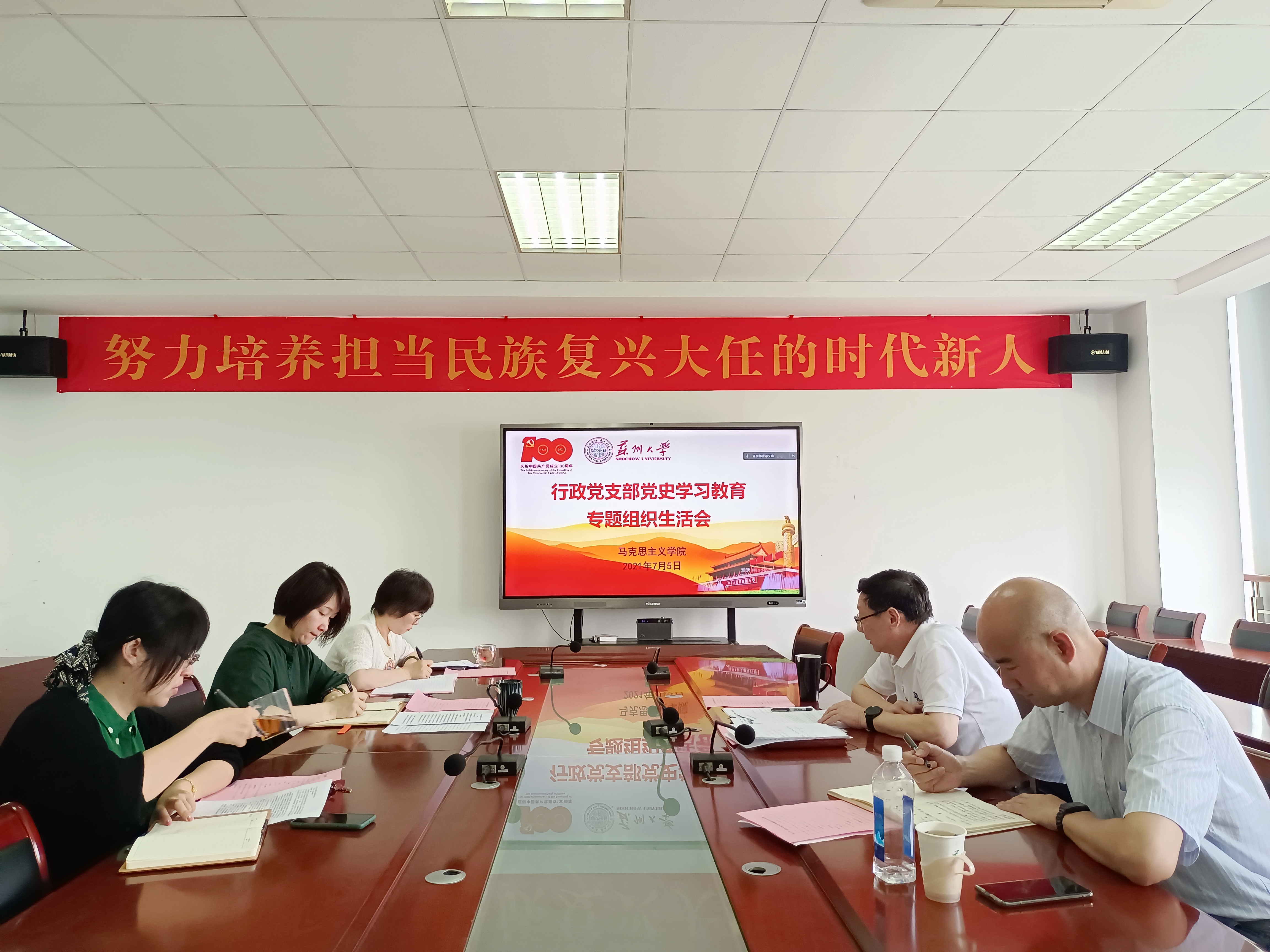 为扎实推进党史学习教育走深走实,根据学校《关于开展专题党课和召开专题组织生活会的通知》等文件精神,2021年7月5日上午,苏州大学马克思主义学院党委行政党支部在独墅湖校区606号楼6418会议室召开党史学习教育专题组织生活会。支部全体党员参加会议,支部书记李文娟主持会议。
