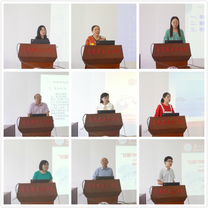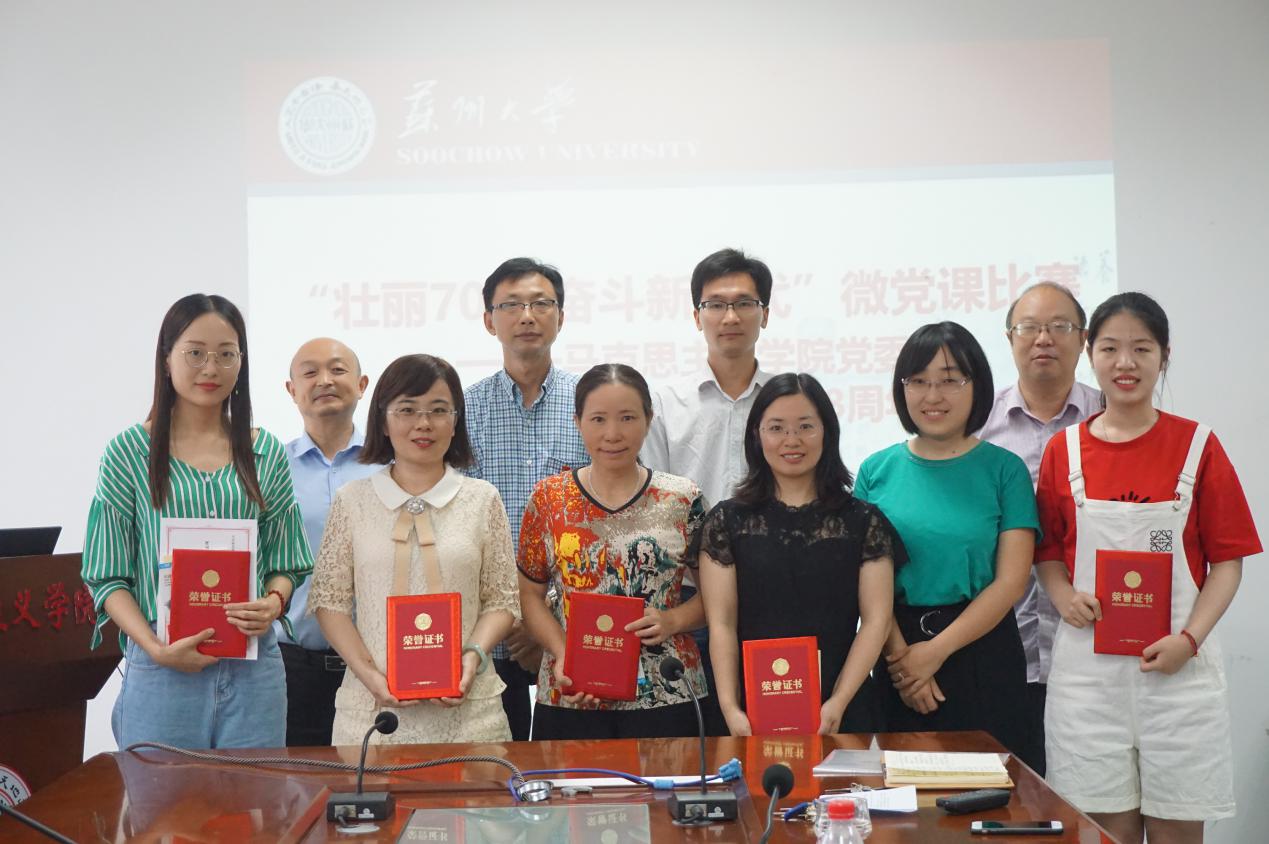 在我们即将迎来新中国成立70周年华诞和中国共产党成立98周年之际,2019年6月28日下午,苏州大学马克思主义学院党委举行以“壮丽70年 奋斗新时代”为主题的微党课比赛,向新中国成立70周年华诞致敬,向建党98周年献礼。本次微党课比赛由马克思主义学院党委主办,由马克思主义学院研究生党支部承办。学院党委书记张才君、政治与公共管理学院专职组织员曾永安、黔南民族师范学院马克思主义学院副教授、苏州大学马克思主义学院访问学者赵龙成为特邀评委。比赛活动由马克思主义学院组织人事秘书刘媛媛老师主持。