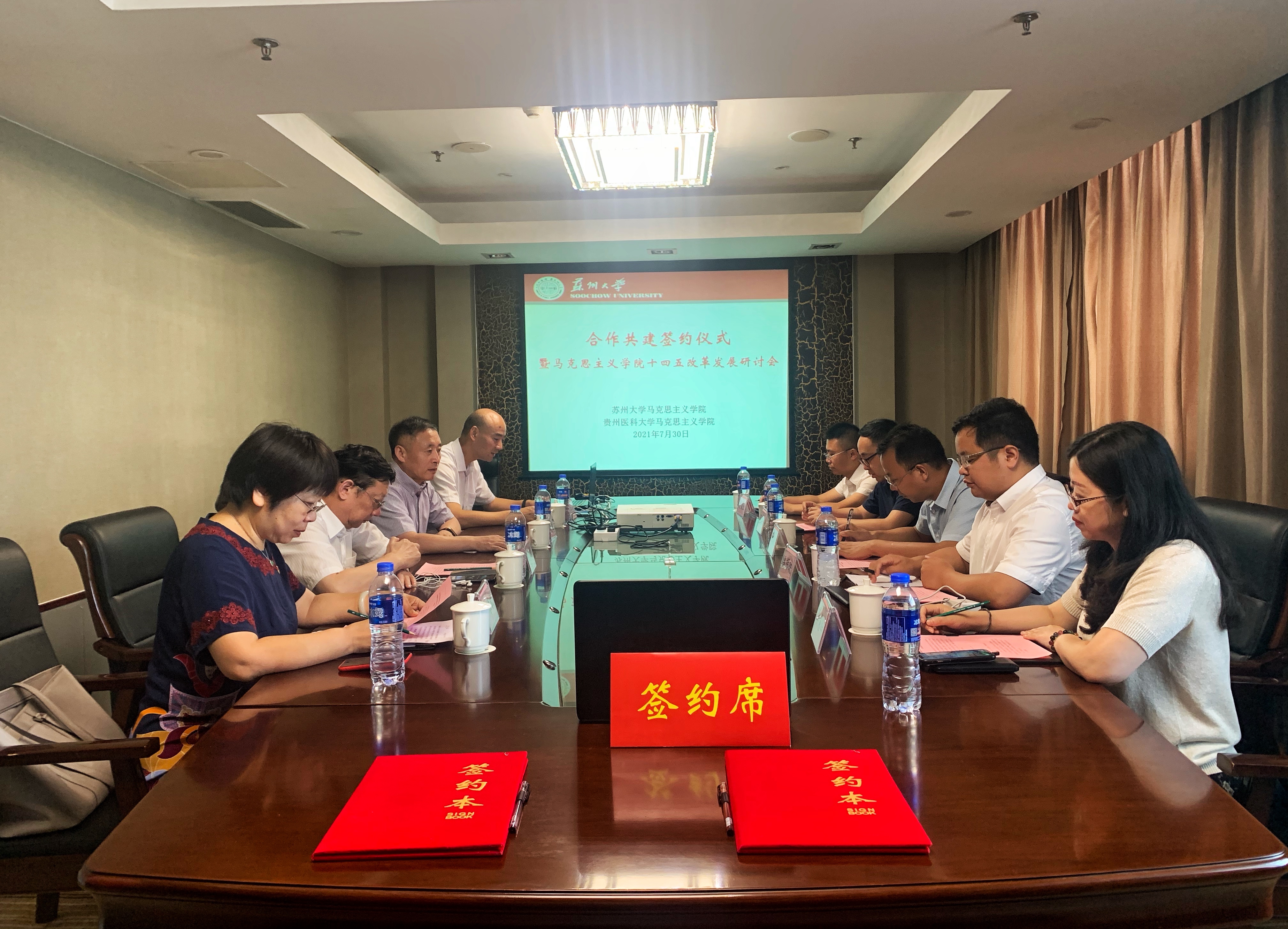 苏州大学马克思主义学院党委书记陈建军、贵州医科大学马克思主义学院党委书记黄鑫权共同签署了合作共建框架协议。