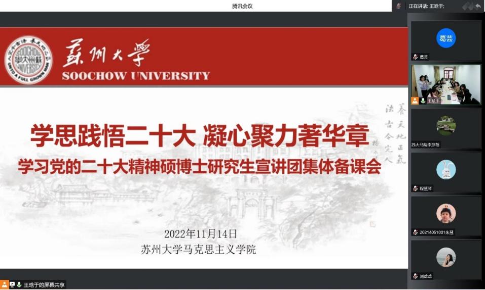 与会成员积极分享了自己的学习心得。王东旭同学认为通过理论宣讲可以在校内外展示苏州大学马克思主义学院的青春风采。王林宇同学表示马克思主义中国化与时代化要做到两个结合,坚持运用辩证唯物主义和历史唯物主义,一切从实际出发,形成与时俱进的理论成果,更好地指导中国实践。朱栎蓉同学认为学习贯彻党的二十大精神,需要有历史自觉和主动精神,要运用马克思主义学院学科优势,担当青年责任,立志做有理想、敢担当、能吃苦、肯奋斗的新时代好青年。