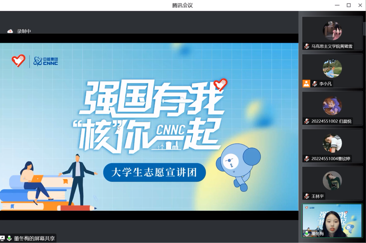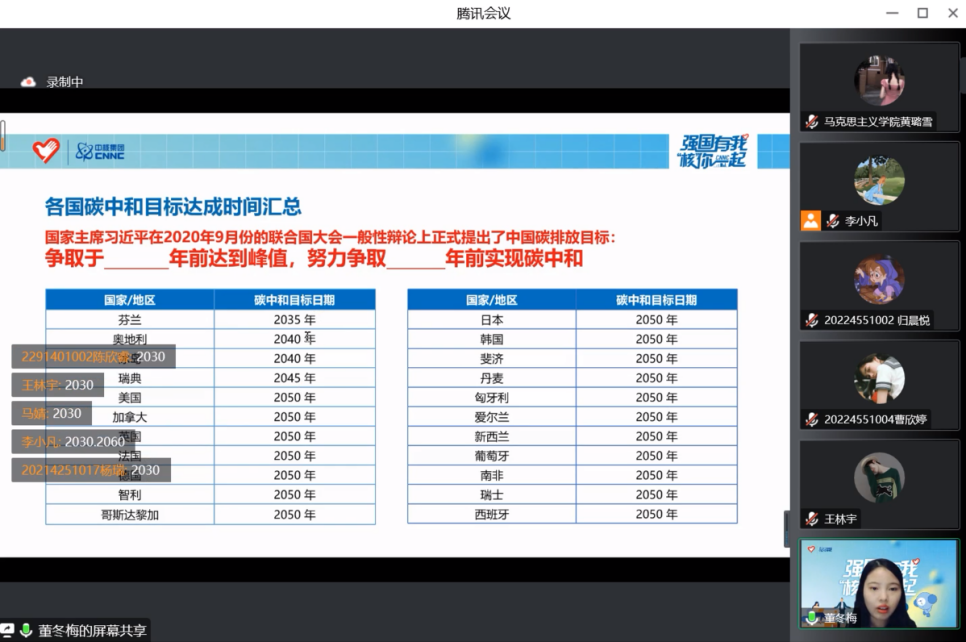2021级硕士研究生董冬梅为此次宣讲活动主讲人。她首先介绍了碳中和的概念以及通过特殊的方式去除温室气体、使用可再生能源减少碳排放等实现碳中和的方法。为了让同学们进一步认识到实现碳中和的重要意义,董冬梅以互动的方式向大家提问“中国二氧化碳排放力争于何时达到峰值以及何时实现碳中和?”同学纷纷在评论区里互动,宣讲氛围活跃。紧接着,董冬梅着重向大家介绍了以“强核是事业,报国是承诺,创新是法宝,奉献是境界”为内涵的“新时代核工业精神”,她强调2022年是“十四五”承上启下的关键之年。核能作为实现“双碳”目标的重要选择,不仅是实现绿色高质量发展的重要助力,也是世界的高新科技之一,核工业集团将始终坚定不移贯彻落实习近平总书记重要指示批示精神,争做“强核报国 创新奉献”的倡导者、传播者、践行者,为新时代核工业改革发展做出新的更大贡献。
