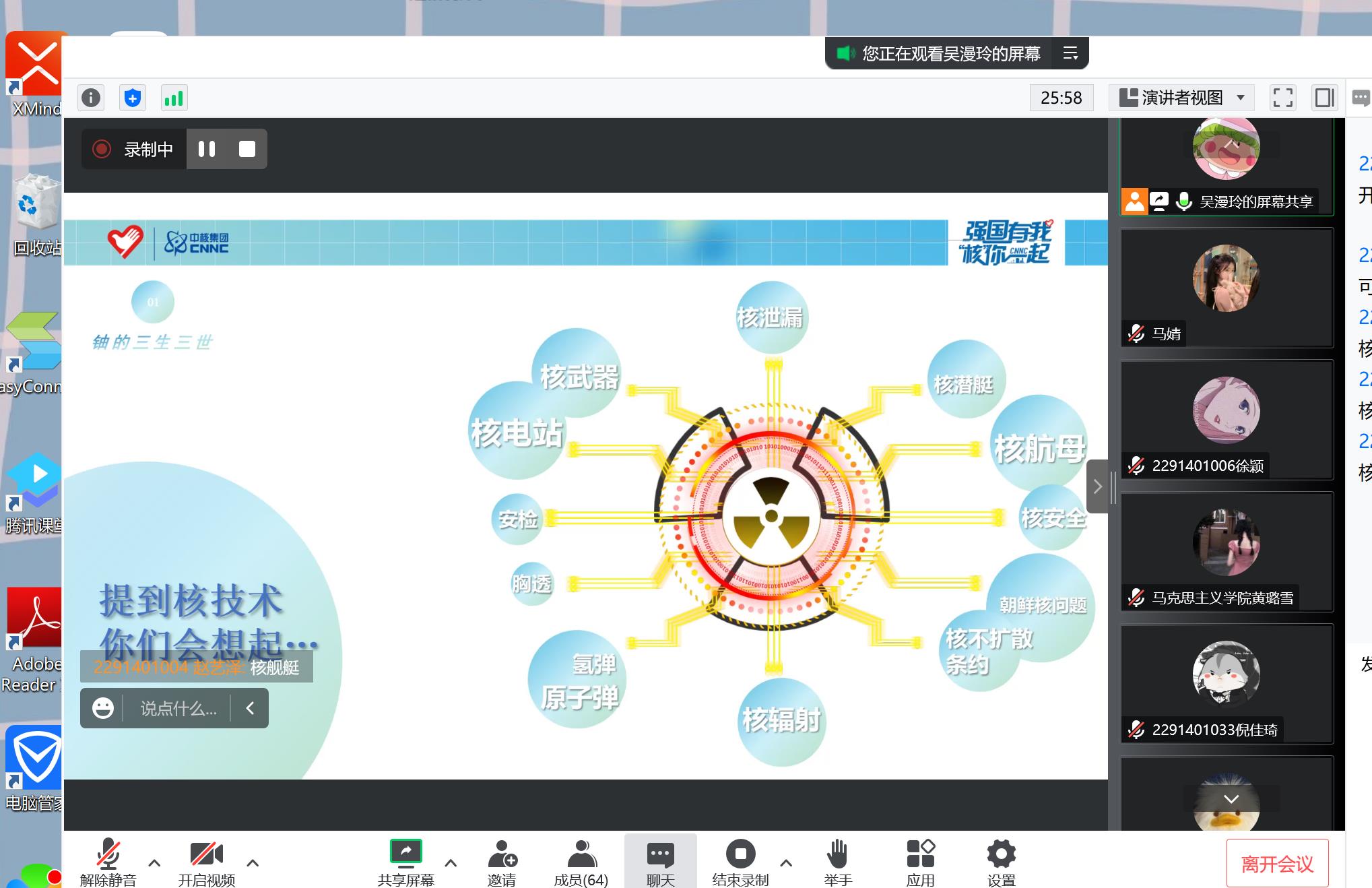 2021级硕士研究生吴漫玲为本次活动宣讲人,她主要从铀矿勘探到核能发电、铀的浓缩、核燃料循环过程、核安全及核环保这四个部分来为大家探秘了核电站的世界,使在场同学深刻认识到推动能源革命,积极安全有序发展核电,是实现碳达峰、碳中和的重要举措,激励同学们践行简约适度、绿色低碳、文明健康的生活方式。