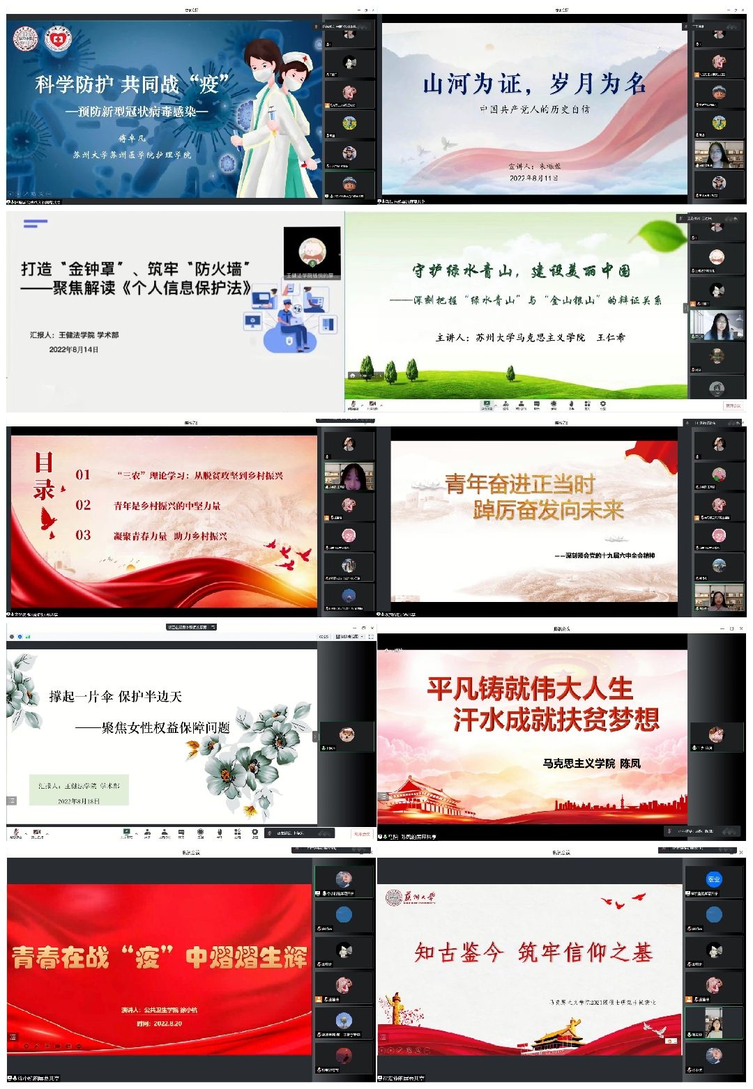 在联学活动中,二十七家研究生基层培养单位的研究生们立足各自专业优势,以“学习习近平新时代中国特色社会主义思想和党的十九届六中全会精神”为主线,结合疫情防控志愿服务工作、时事热点和暑期社会实践开展了多场理论宣讲与交流讨论。苏州大学马克思主义学院“青进青听青年说”暑期社会实践团队成员分别围绕“山河为证,岁月为名——中国共产党人的历史自信”、“守护绿水青山,建设美丽中国”、“青年奋进正当时 踔厉奋发向未来”、“平凡铸就伟大人生 汗水成就扶贫梦想”、“知古鉴今 筑牢信仰之基”等主题进行理论宣讲;苏州医学院护理学院和公共卫生学院研究生就疫情期间投身抗疫一线的志愿服务经历和疫情防护知识进行分享,让与会师生在掌握有效的防护技能的同时,进一步明确了新时代青年应有的责任与担当;王健法学院研究生对《个人信息保护法》和与女性权益保障相关法律法规的解读提高了同学们的法律意识;文学院研究生围绕乡村振兴和近期文学院优秀暑期社会实践团队实例,让与会师生对新时代青年应具有的本领和担当有了更加深刻的认识。参会研究生们都在活动中围绕宣讲内容结合当下社会热点踊跃发表意见、互相交流看法,思想碰撞产生的火花让联学活动真正做到了联建联学、互学互鉴、共促共赢。此次联学活动汇聚各学院的优势,有效发挥不同专业研究生们的特长,提升了学习活动的理论性、创新性和实效性。