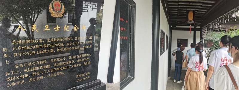 苏州市警察博物馆所处位置最早是江苏按察司监和苏州府监所在地。从清末时期的苏省警察总局到苏州市公安局,苏州警察走过了百年历程。在这所古老的建筑内,可以完整看到苏州警察创建和发展的过程。在讲解员的引导和讲解下,实践团队依次参观了警察博物馆的四个展室。通过博物馆大门,首先映入眼帘的是位于两侧走廊的人民卫士纪念碑。右侧走廊,是古代授予苏州人民卫士的古碑;左侧走廊,则是解放以来苏州市英勇牺牲的人民卫士纪念碑。纪念碑隔空呼应,庄严肃穆,凝聚了自古以来人民卫士身上的赤胆忠心、无私奉献、英勇战斗的精神气质,使团队成员们肃然起敬。第一展室主要是介绍清末、民国时期警察的一些历史文物,第二展室展示了苏州解放以来的一些重要案件、因公殉职的烈士资料、调查器具,第三展室主要展示治安防控、公安装备、消防管理等内容,第四展室为交通管理、涉外警务活动、荣誉等内容。团队成员们对苏州公安如何保障人民生命财产安全、维护社会大局稳定有了深入了解,感受到了广大公安干警为平安苏州、平安中国建设所做出的坚守与奉献。