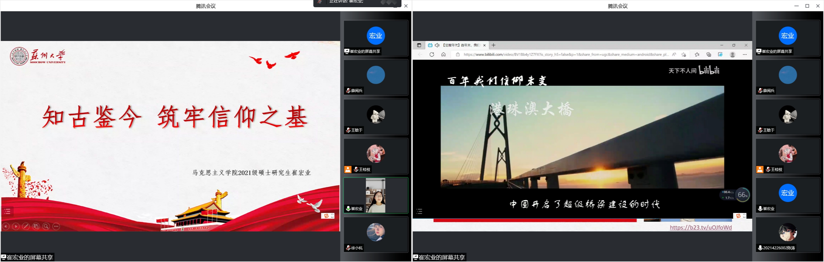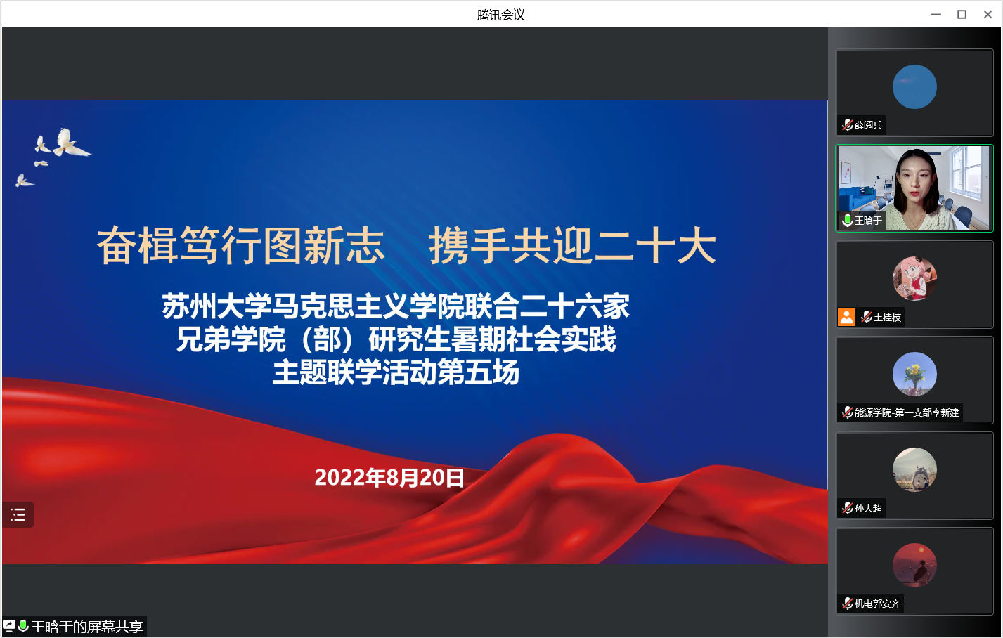 8月20日,苏州大学马克思主义学院联合二十六家学院(部)在线举办研究生暑期社会实践之主题联学第五场顺利开展。能源学院、公共卫生学院、传媒学院、放射医学与防护学院、沙钢钢铁学院、药学院、机电工程学院、纳米科学技术学院研究生代表,马克思主义学院研究生第一党支部参加了本次主题联学。本次活动由马克思主义学院主办,公共卫生学院、传媒学院、放射医学与防护学院、沙钢钢铁学院、能源学院、药学院、机电工程学院、纳米科学技术学院协办,马克思主义学院学生党总支、研究生会、思想政治教育研究会、“青进青听青年说”暑期社会实践团队承办。活动由马克思主义学院2021级硕士研究生王晗于主持。
