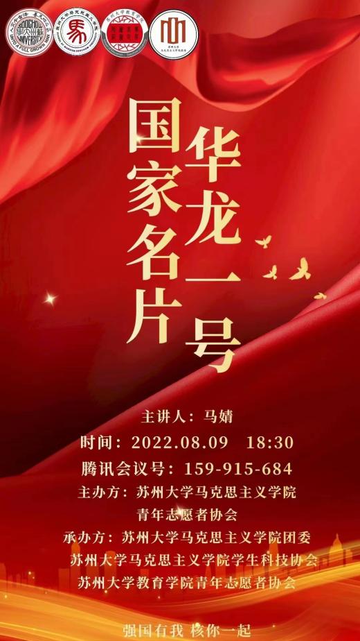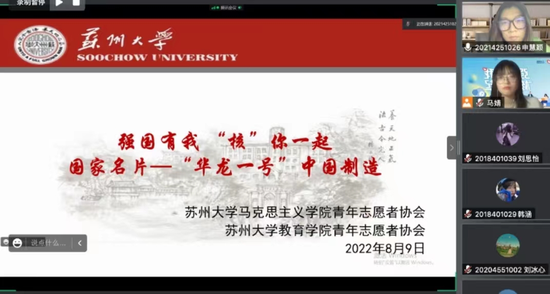 8月9日,苏州大学马克思主义学院青年志愿者协会宣讲团顺利开展“强国有我,‘核’你一起”大学生志愿宣讲活动,本期宣讲主题为“国家名片—‘华龙一号’中国制造”。本次活动由马克思主义学院青年志愿者协会主办,马克思主义学院团委、马克思主义学院学生科技协会、教育学院青年志愿者协会承办。活动由2021级硕士研究生申慧颖主持。