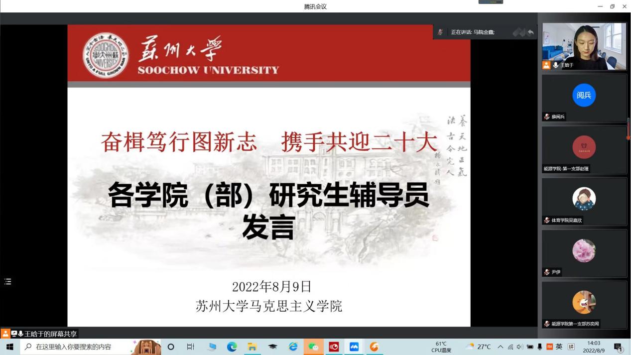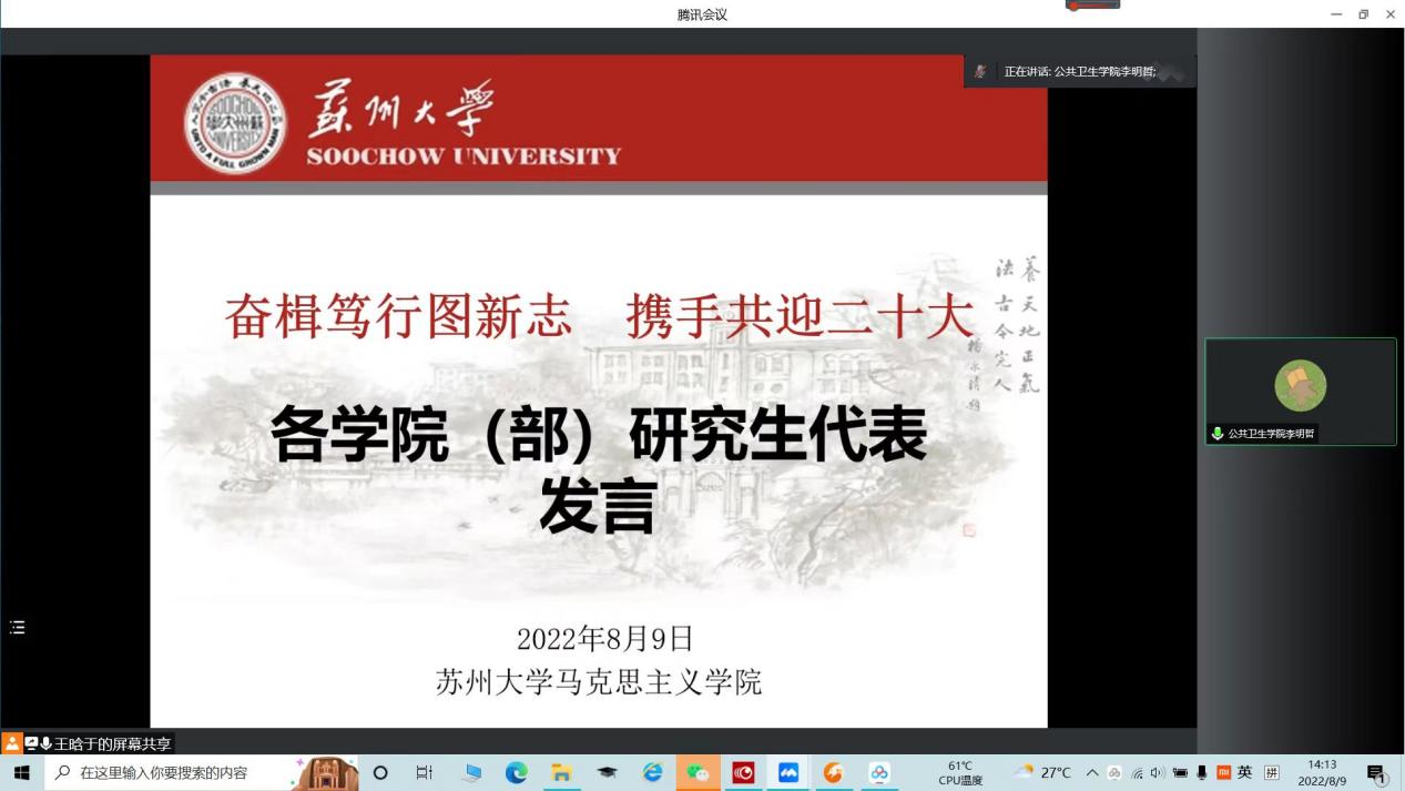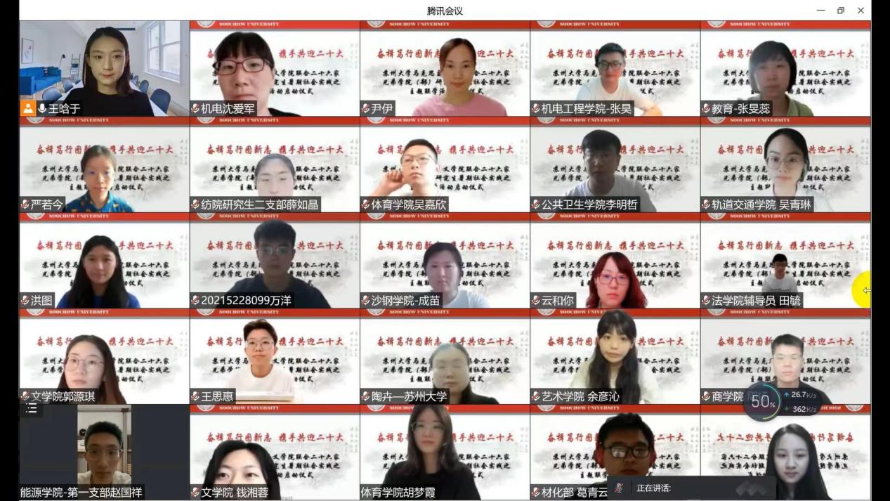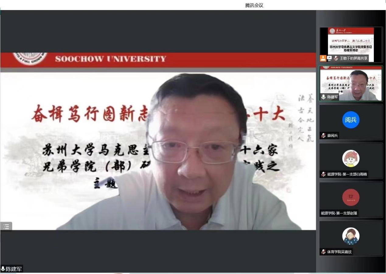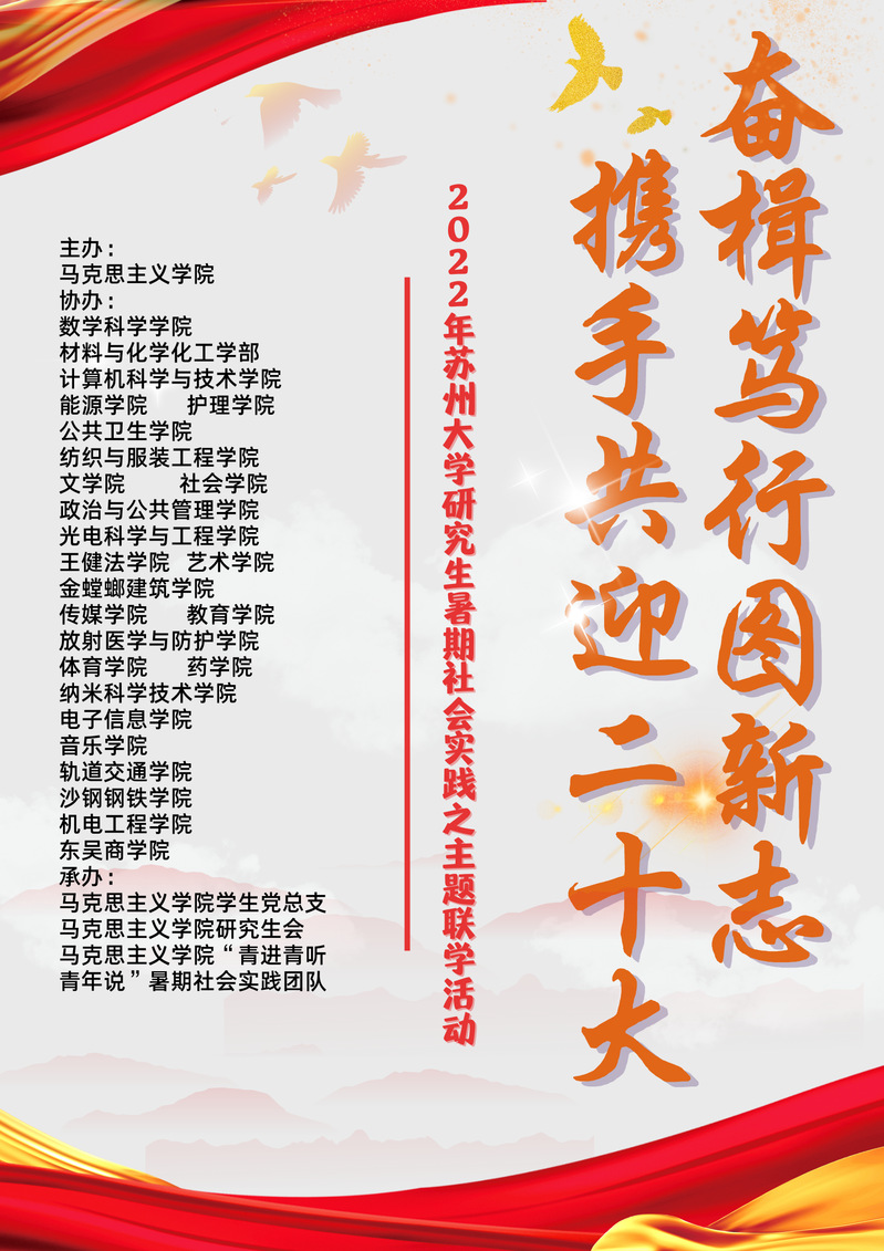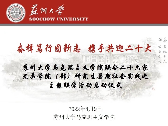 为进一步深入学习贯彻习近平新时代中国特色社会主义思想和党的十九届六中全会精神,响应苏州大学“喜迎二十大 永远跟党走 奋进新征程”暑期社会实践的号召,8月9日,苏州大学马克思主义学院联合苏州大学二十六家兄弟学院(部)举办“奋楫笃行图新志 携手共迎二十大”研究生暑期社会实践之主题联学活动启动仪式。马克思主义学院党委书记陈建军出席本次活动,马克思主义学院、数学科学学院、材料与化学化工学部、计算机科学与技术学院、能源学院、公共卫生学院、护理学院、纺织与服装工程学院、文学院、社会学院、政治与公共管理学院、光电科学与工程学院、王健法学院、艺术学院、金螳螂建筑学院、传媒学院、教育学院、放射医学与防护学院、轨道交通学院、沙钢钢铁学院、机电工程学院、东吴商学院、体育学院、纳米科学技术学院、药学院、电子信息学院、音乐学院共二十七家基层研究生培养单位师生代表参加了本次启动仪式。本次活动由马克思主义学院主办,苏州大学二十六家基层研究生培养单位协办,马克思主义学院学生党总支、研究生会、“青进青听青年说”暑期社会实践团队承办。启动仪式由马克思主义学院2021级硕士研究生王晗于主持。
