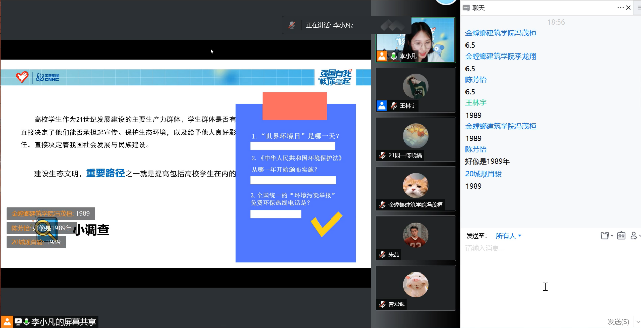 在知识竞答环节,现场互动学习氛围活跃。同学们围绕生态文明的相关知识以自由抢答的方式进行答题,竞答过程紧张有趣,充分激发了同学们对生态文明问题的兴趣与关注。