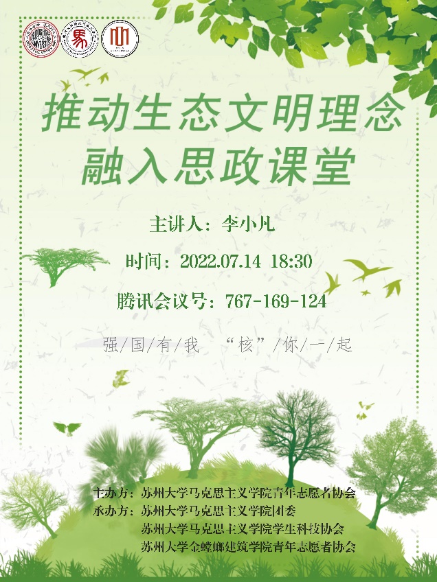 7月14日,苏州大学马克思主义学院青年志愿者协会宣讲团顺利开展“强国有我 ‘核’你一起”大学生志愿宣讲活动,本期宣讲主题为“推动生态文明理念融入思政大课堂”。本次活动由马克思主义学院青年志愿者协会主办,马克思主义学院团委、马克思主义学院学生科技协会、金螳螂建筑学院青年志愿者协会承办。活动由2021级硕士研究生刘冰心主持。