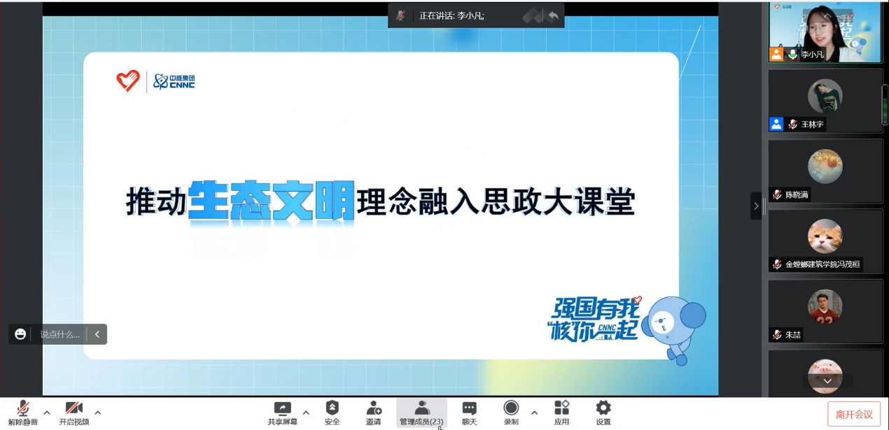 在交流分享环节,同学们表示,生态文明建设可以融入学生社团活动和暑期社会实践,作为新时代的大学生,我们应多多关注生态文明问题,积极参与生态文明实践活动,将生态文明意识融入到专业学习和工作中。