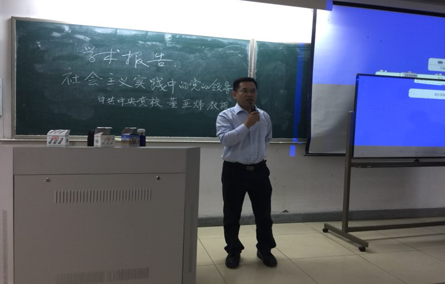 董亚炜教授的报告主要从社会主义的本质、社会主义实践中应坚持党的领导、中国共产党的性质特点、我国政党理论的发展创新以及现阶段我国党的领导实践等五个方面对社会主义实践过程中党的领导作了深刻分析,报告赢得了与会师生的热烈掌声。