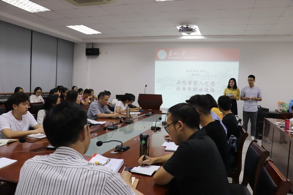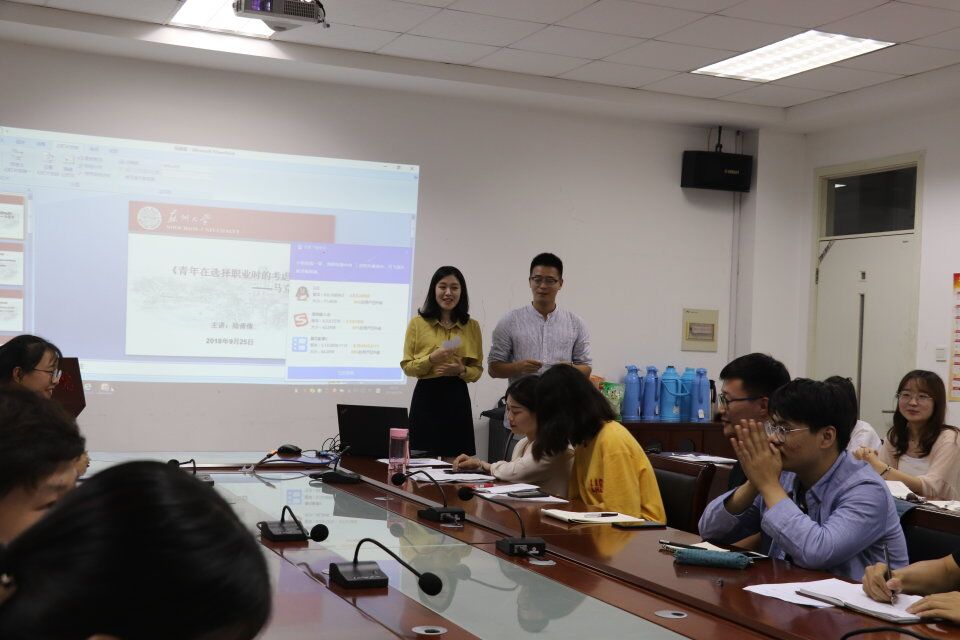 9月26日晚,苏州大学马克思主义学院于独墅湖校区606-6418举行了马克思主义理论学科研究生新学期第一次“读书·研究·写作”报告会。2018级全体硕士研究生分为六组,基于对马克思《青年在选择职业时的考虑》的原著选读,依次分享了自身阅读感悟。院长田芝健教授、院党委书记张才君教授、院教学科研办公室主任李文娟老师、研究生会主席张巩轶、习近平新时代中国特色社会主义思想研究会会长毛瑞康以及2018级全体硕士研究生参与了此次报告会。报告会由2018级硕士研究生李成、刘珮雯主持。