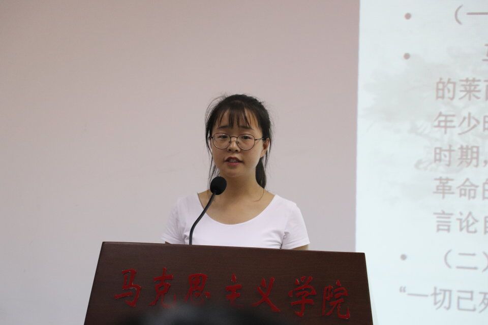 第四组成员代表徐亚宁带领大家欣赏原文后从影响马克思思想的因素、青年马克思职业选择的方向原则、马克思眼中我们应该怎么样选择职业以及《青年在选择职业时的考虑》的当代价值四个方面解读了文章。她表示我们提倡的是将理想和现实、精神和物质统一起来,将个人利益和集体利益结合起来,把个人理想融入全体人民的共同理想当中,把个人的奋斗融入到为祖国社会主义现代化建设事业的奋斗当中。