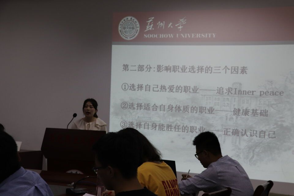 第六组成员代表陆倩倩从“90后辞职高潮”这一热点话题进行分析,重点介绍了选择最能为人类幸福而工作的职业的实现路径和启发。 她认为,如今90后缺乏合作精神、过于追求舒服以及崇尚个性化等特点是导致辞职高潮的主要原因。针对这个现象,她总结了四点自己的解决方法:其一,端正态度、坚持严肃思考。其二,量力而行,充分考虑影响择业的主客观条件。其三,遵循追求人类幸福与自身完美指针,树立科学择业观。其四,未雨绸缪,增强职业生涯规划的自主意识。