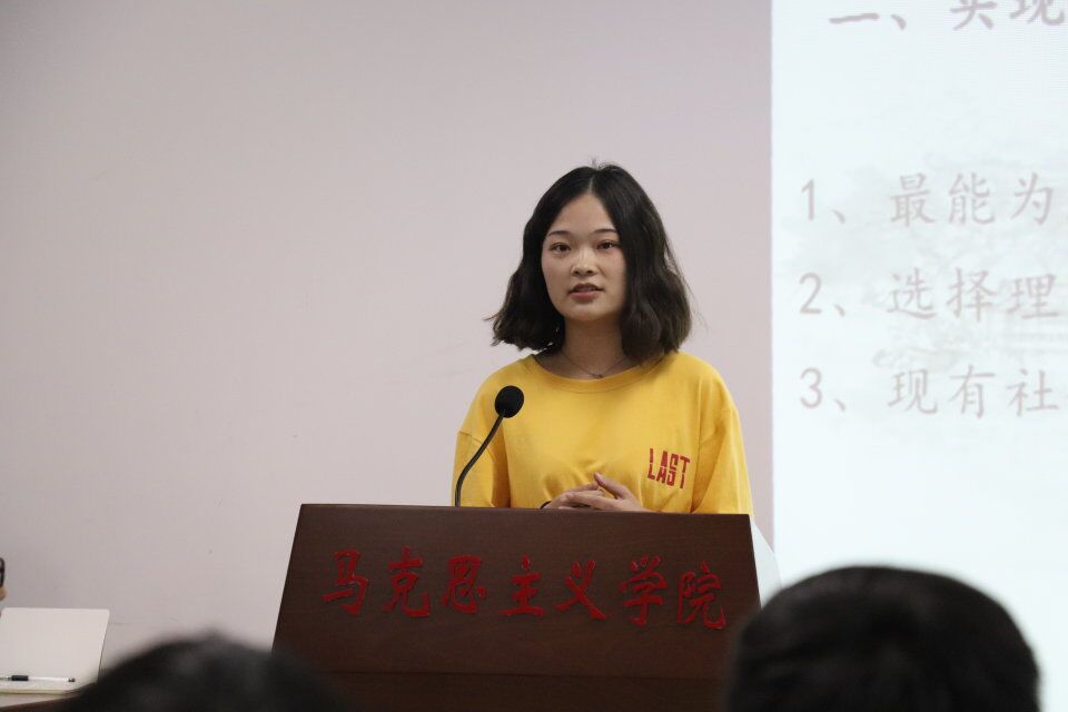 第五组成员代表王欢从马克思的青年择业观、马克思的青年择业观念来源以及马克思的青年择业观的启示三个方面对自己的阅读感悟作了讲解。王欢在报告中说道,青年在选择职业时,要做到个人价值与社会价值的统一。人的价值就在于对社会的贡献,即通过自己的活动满足社会、他人以及自己的需要。个人对社会的贡献是实现人生价值的基础和源泉。