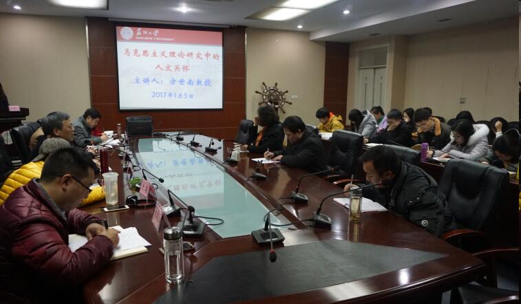 为贯彻习近平总书记在全国高校思想政治工作会议上的重要讲话精神,1月5日下午6:30—9:30,苏州大学马克思主义学院举办了 “读书•研究•写作”报告会2017年首场学术茶座,本次学术茶座以“严谨治学·勤奋治学·科学治学·为民治学”为主题,特邀马克思主义学院博士生导师方世南教授、院长田芝健教授、副院长许冠亭教授、马克思主义理论博士后流动站博士后于莲、2015级思想政治教育专业博士生佘明薇、2016级马克思主义基本原理专业博士生吉启卫等作主题发言。院党委书记张才君教授、马克思主义理论博士后流动站负责人姜建成教授、院团委书记郑芸副教授、研究生班主任林慧萍副教授等老师及在校博士生、硕士生参加了此次报告会(学术茶座)。报告会(学术茶座)由马克思主义学院研究生会主席李佳娟主持。