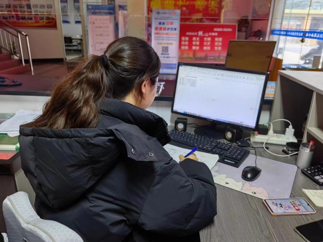 图为徐颖同学协助核实老年人意外保险缴纳情况