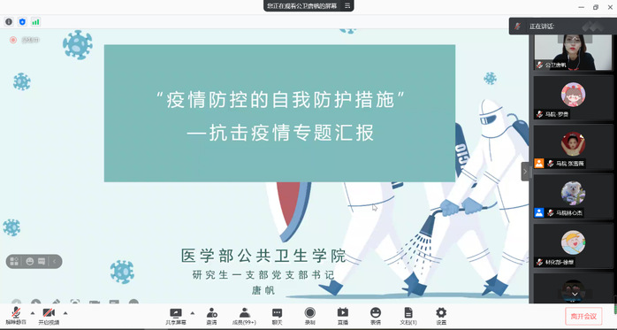苏州大学公共卫生学院硕士研究生唐帆作主题为“疫情防控的自我防护措施”抗击疫情专题汇报。她通过分享身边疫情防控志愿者冲锋在一线的苏大学子事迹向大家展示了新时代青年奋斗者们的志愿精神与担当意识。同时,从核酸检测点民众注意事项、身体不同部位的卫生清洁注意事项、心理防护和情绪管理注意事项等方面对疫情防控的自我防护措施作了详细的知识讲解。她强调,新时代的青年生逢盛世、肩负重任,要时刻听党话、感党恩、跟党走,在社会实践中找寻人生价值,在志愿服务中贡献青春力量。