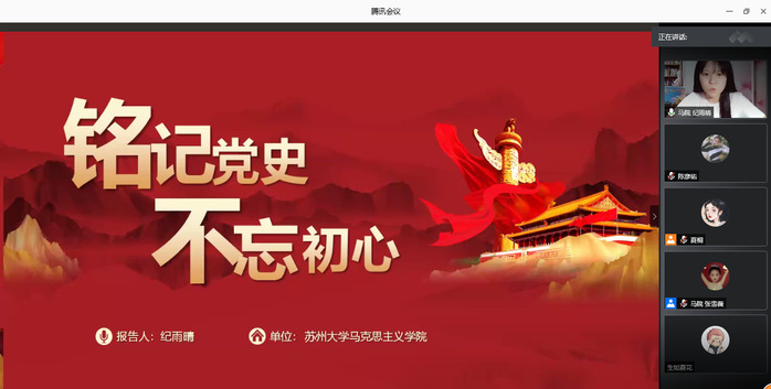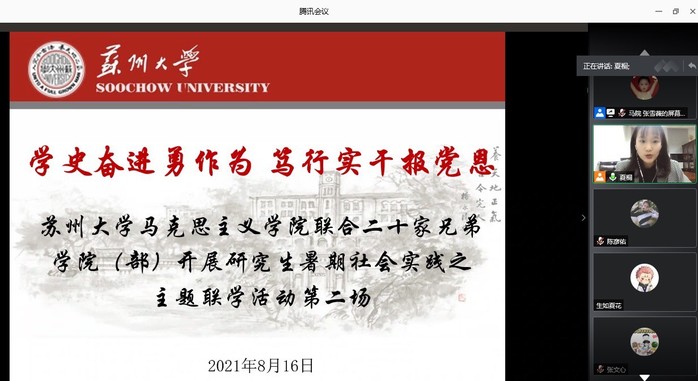 8月16日,苏州大学马克思主义学院联合苏州大学二十家兄弟学院(部)在线举办研究生暑期社会实践之主题联学活动第二场。苏州大学王健法学院研究生辅导员付晨熙、艺术学院研究生辅导员仇松莹、放射医学与防护学院研究生辅导员朱一丹、光电科学与工程学院研究生辅导员黄彦龙、马克思主义学院研究生辅导员金鑫出席会议,王健法学院学术型研究生第三党支部及法律硕士(法学)第二党支部、放射医学与防护学院研究生第一党支部及第二党支部、光电科学与工程学院研究生第一党支部及第二党支部、艺术学院研究生会、马克思主义学院研究生党支部及研究生会参加了本次活动。本次活动由马克思主义学院主办,苏州大学二十家二级学院(部)协办,马克思主义学院“习近平总书记关于党的历史的重要论述”研究生宣讲团、分团委、研究生党支部、研究生会、思想政治教育研究会承办。会议由马克思主义学院硕士研究生夏桐主持。