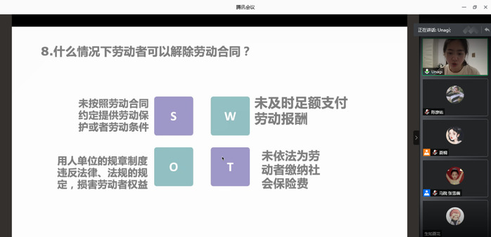 王健法学院硕士研究生陈庆就劳动法相关法律知识进行了讲解。陈庆结合实际案例,从劳动合同、工作时间和休息休假、工资与社会保险、女职工特殊保护、劳动争议的解决办法五个方面详细介绍了劳动法相关的法律知识。陈庆希望劳动法的相关知识能够为大家就业、工作、生活解决困难、提供帮助,并鼓励大家在今后的学习、工作、生活中提高相关法律意识,学会用法律武器保护自己的合法权益。