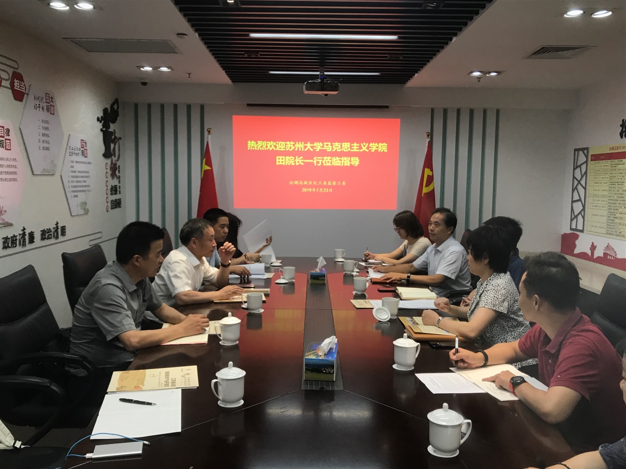 7月23日,苏州大学马克思主义学院田芝健教授带队,苏州工艺美术职业技术学院杨建春副教授、苏州大学马克思主义学院习近平新时代中国特色社会主义思想宣讲团成员毛瑞康、马克思主义理论学科硕士生王者愚和尚晨靖一行赴昆山和吴江进行社会信用与营商环境、廉洁品牌以及思政课教学研究实践基地建设专题调研。