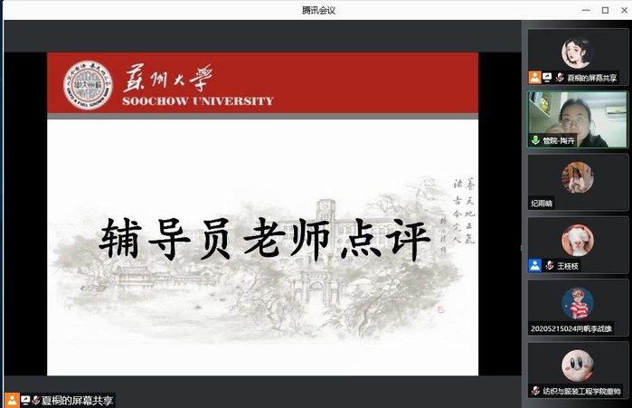 与会的各位辅导员老师针对本次联学活动发表了自己的看法。纺织与服装工程学院研究生辅导员蒋闰蕾老师希望与会师生能借助此次联学的新形式和新机会深刻学习党史;希望青年学子们能够铭记弘扬建党精神、增强家国情怀、发挥好开路先锋的带头作用。政治与公共管理学院研究生辅导员陶卉老师对发言的各位同学进行了细致的点评,她讲到,在建党百年之际,希望青年一代可以积极学习理论知识、在实践中提升、在奋斗中升华,打好基本功、敢为人先,为实现中华民族的伟大复兴贡献自己的青春力量。马克思主义学院研究生辅导员金鑫老师谈到党的百年历史是中国共产党宝贵的精神财富,继承和发扬红色血脉是新时代青年的光荣责任。她激励青年一代要在党的带领下坚持人民至上,在灾害和疫情中挺身而出、勇往直前,希望同学们在红色资源的浸润下薪火相传,在红色基因的传承中勇担使命。