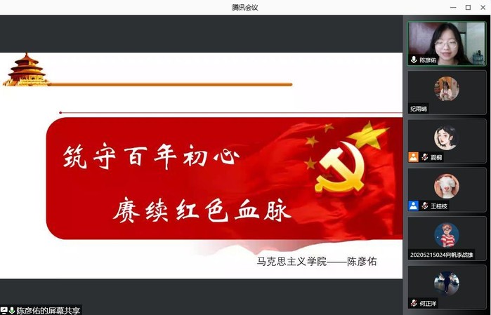 马克思主义学院“习近平总书记关于党的历史的重要论述”研究生宣讲团成员陈彦佑进行了主题为“筑守百年初心 赓续红色血脉”的宣讲。她从坚持真理、坚守理想;践行初心、担当使命;不怕牺牲、英勇斗争;对党忠诚、不负人民四个板块对党史的相关理论知识进行了阐述,从红色故事的娓娓道来到红色精神的感染熏陶,讲述了不同历史时期的青年一代的崇高理想和热血青春。她号召广大青年生逢盛世当不负盛世,筑守百年初心、赓续红色血脉,以史为鉴、开创未来,为党和国家事业发展奉献自己的青春力量。