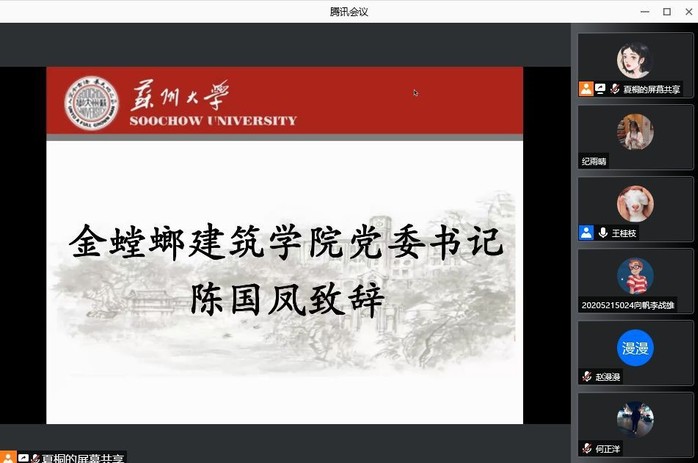 苏州大学金螳螂建筑学院党委书记陈国凤在开场致辞中首先表达了对此次联学活动的肯定与支持,同时希望参加活动的广大师生能够发挥在理论学习中的标杆作用,真正做到将党史理论知识入脑入心;其次,她勉励大家努力提升自己的能力素质和意志品质,把握联学交流活动的良好契机,统一思想、弘扬正气、开拓进取;最后,她对参加此次活动的青年学子提出了要在疫情防控中配合相关工作并在志愿服务中发挥带头作用、通过党史学习教育强化有效交流、注重理论与实践相结合、注重总结等方面的期望。