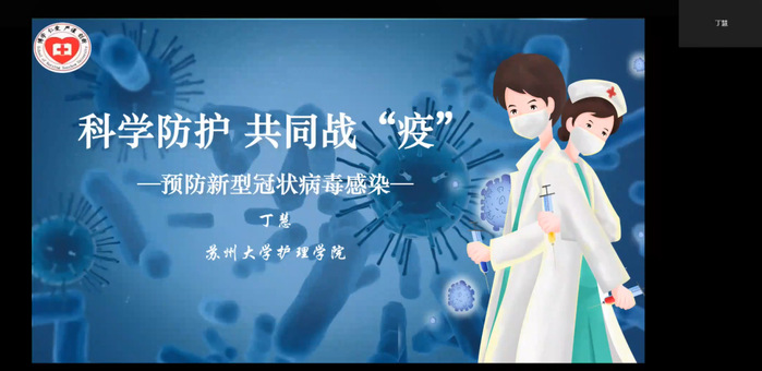 护理学院硕士研究生丁慧进行了主题为“科学防护,共同战‘疫’”的宣讲。她对新冠肺炎相关问题进行简介,并从戴口罩、勤洗手、少外出等方面向大家普及日常预防措施。同时,从驰援前线保四方、同伴支持送温暖、防疫手册正当时等方面激励大家为疫情防控贡献自己的绵薄之力。
