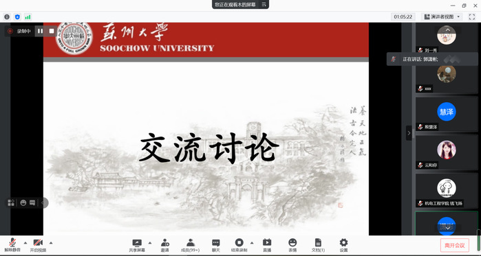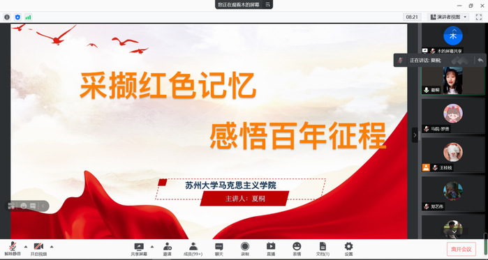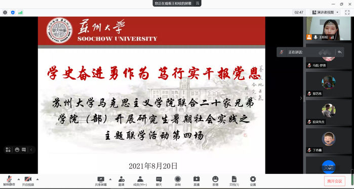 8月20日,苏州大学马克思主义学院联合苏州大学二十家兄弟学院(部)开展的研究生暑期社会实践之主题联学活动第四场顺利举行。苏州大学能源学院组织员顾燕、教育学院研究生辅导员张旻蕊、马克思主义学院研究生辅导员金鑫出席本次活动,能源学院研究生第一党支部、第二党支部、教育学院全体研究生预备党员与入党积极分子、机电工程学院研究生党支部及研究生会、护理学院研究生会、马克思主义学院研究生党支部及研究生会参加了本次活动。本次会议由马克思主义学院主办,苏州大学二十家二级学院(部)协办,马克思主义学院“习近平总书记关于党的历史的重要论述”研究生宣讲团、分团委、研究生党支部、院研究生会、思想政治教育研究会承办。会议由马克思主义学院硕士研究生王桂枝主持。