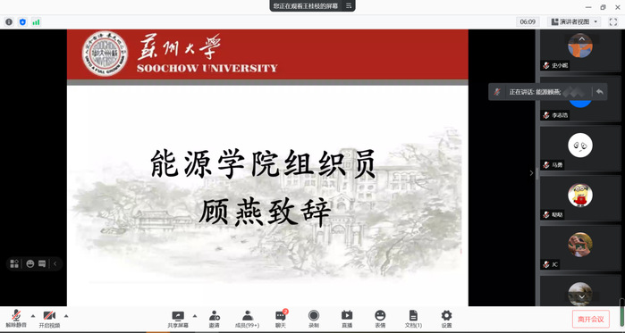 苏州大学能源学院组织员顾燕老师在致辞中谈到,希望广大师生在联学中能够创新好思维方式、利用好实践平台,拓宽思路,真正做到“学史奋进勇作为,笃行实干报党恩”,为今后的学习工作提供理论源泉和实践导向。同时,她勉励与会青年学子秉承“请党放心,强国有我”的信念,利用好专业优势,在当下的疫情防控工作中贡献自己的力量,肩负起时代振兴的重任,不负时代,不负韶华。