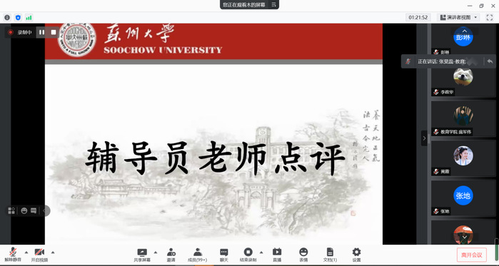 与会的辅导员老师针对本次联学活动发表了自己的感悟。教育学院研究生辅导员张旻蕊充分肯定了两位研究生的深刻宣讲,她以疫情防控工作中展现出的新时代青年风采激励青年学子们学好理论知识,为身边人办实事,并激励各位同学保持初心,将历史映照进现实,转化为科研学习的动力,真正将党史知识学深学透。马克思主义学院研究生辅导员金鑫建议同学们在党史学习教育中努力挖掘红色资源,让身边人讲身边事,用身边事激励身边人,让大家在耳濡目染中重温红色记忆、传承红色基因。同时,她谈到疫情防控是一根不可以松的弦,大家要努力科学防护,众志成城、群策群力,定能取得这场持久战的胜利。