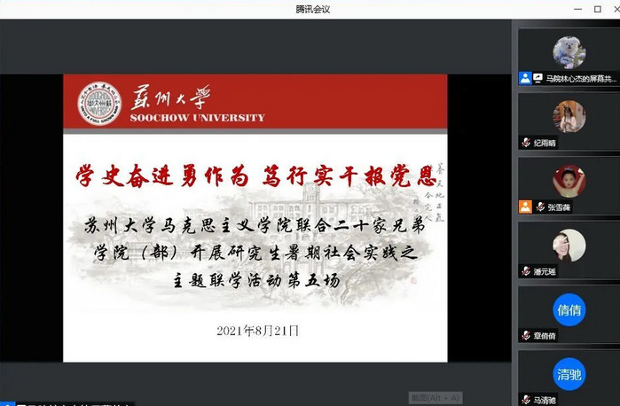 为深入学习贯彻习近平总书记关于民族工作特别是关于铸牢中华民族共同体意识的重要论述精神,8月21日,苏州大学马克思主义学院联合苏州大学二十家兄弟学院(部)开展的研究生暑期社会实践之主题联学活动顺利举行第五场。苏州大学社会学院研究生辅导员朱星洁、数学科学学院研究生辅导员尹伊、马克思主义学院研究生辅导员金鑫出席本次活动。苏州大学数学科学学院研究生第一、第三党支部、社会学院研究生分会、轨道交通学院研究生分会、沙钢钢铁学院研究生分会、马克思主义学院研究生党支部、马克思主义学院研究生分会以及2020级硕士研究生团支部参加了本次活动。本次会议由马克思主义学院主办,苏州大学二十家二级学院(部)协办,马克思主义学院“习近平总书记关于党的历史的重要论述”研究生宣讲团、分团委、研究生党支部、院研究生会、思想政治教育研究会承办。会议由马克思主义学院硕士研究生林心杰主持。