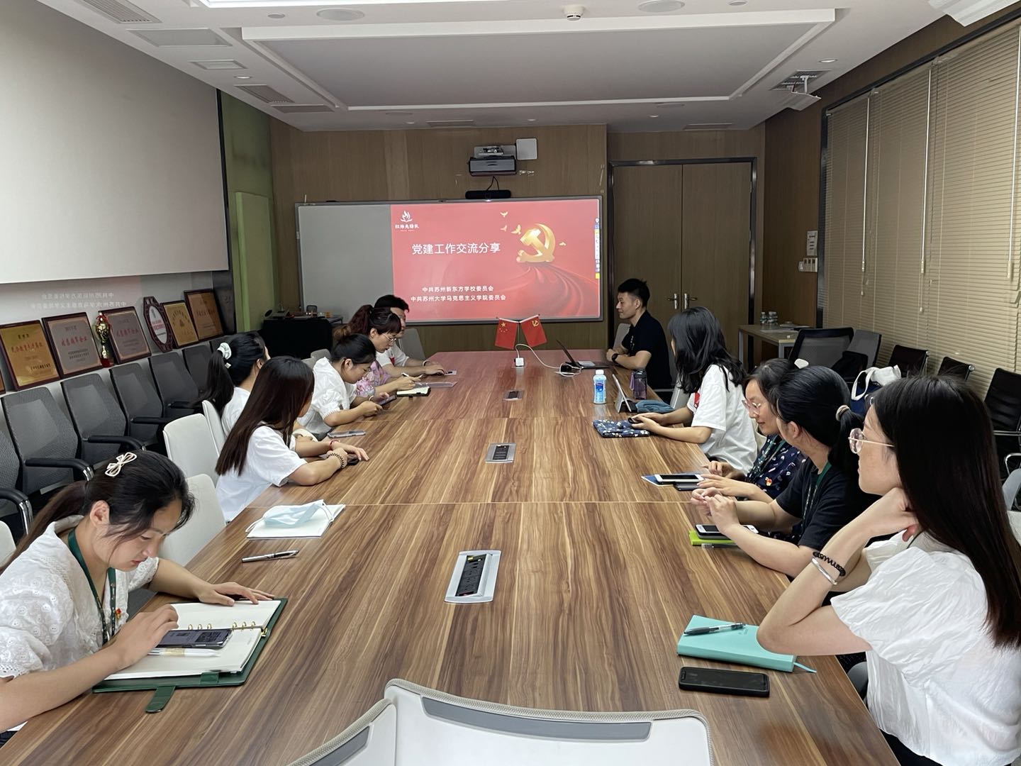 图为:团队成员与新东方苏州学校总部开展党建座谈交流