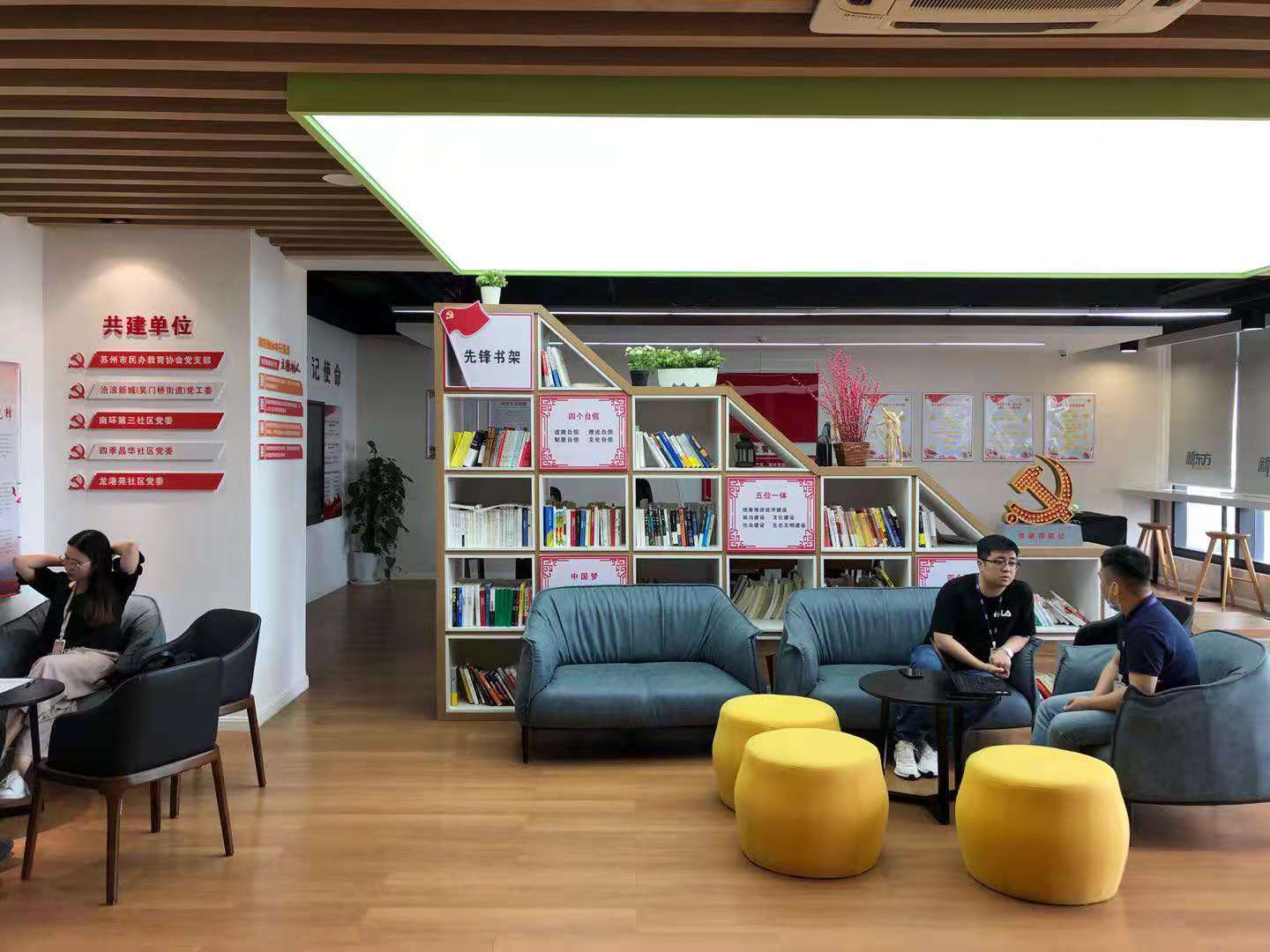 在参观调研环节,苏州新东方学校校长办公室总监助理马荣老师为宣讲团成员介绍了新东方的企业党建文化以及日常教学环境、员工办公情况和管理办法。学校环境温馨、整洁,设有职工休息区、学生自习区、图书阅览室等多项服务性区域。宣讲团成员还注意到一处党建文化的特别区域——“信仰空间”,在这片区域中,随处可见“两学一做”、“四讲四有”、“中国梦”的解读式标语,此外还设有“先锋书架”红色书籍阅读区,实实在在地为党员群众汲取信仰力量提供了物质和空间载体。
